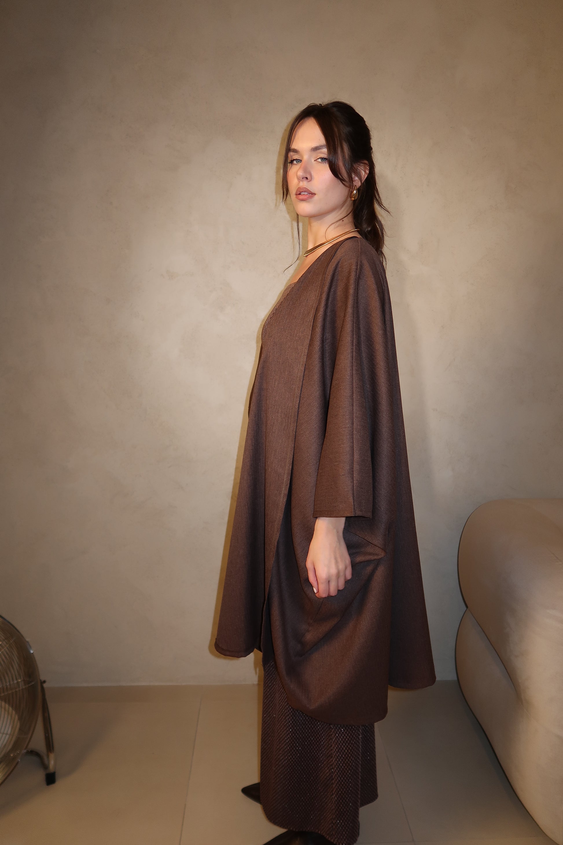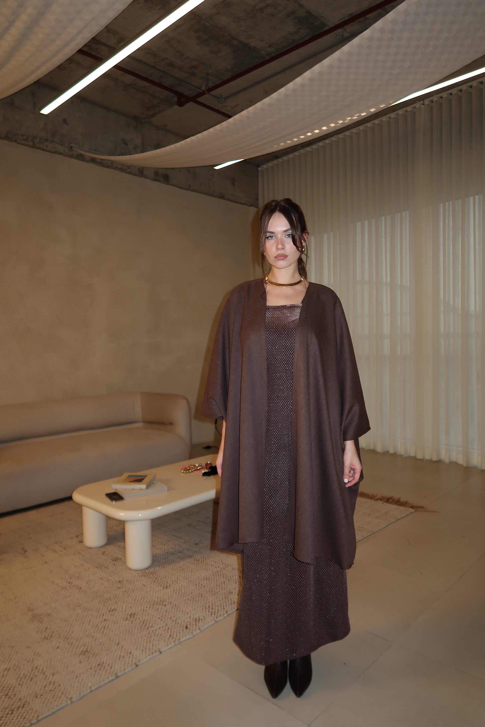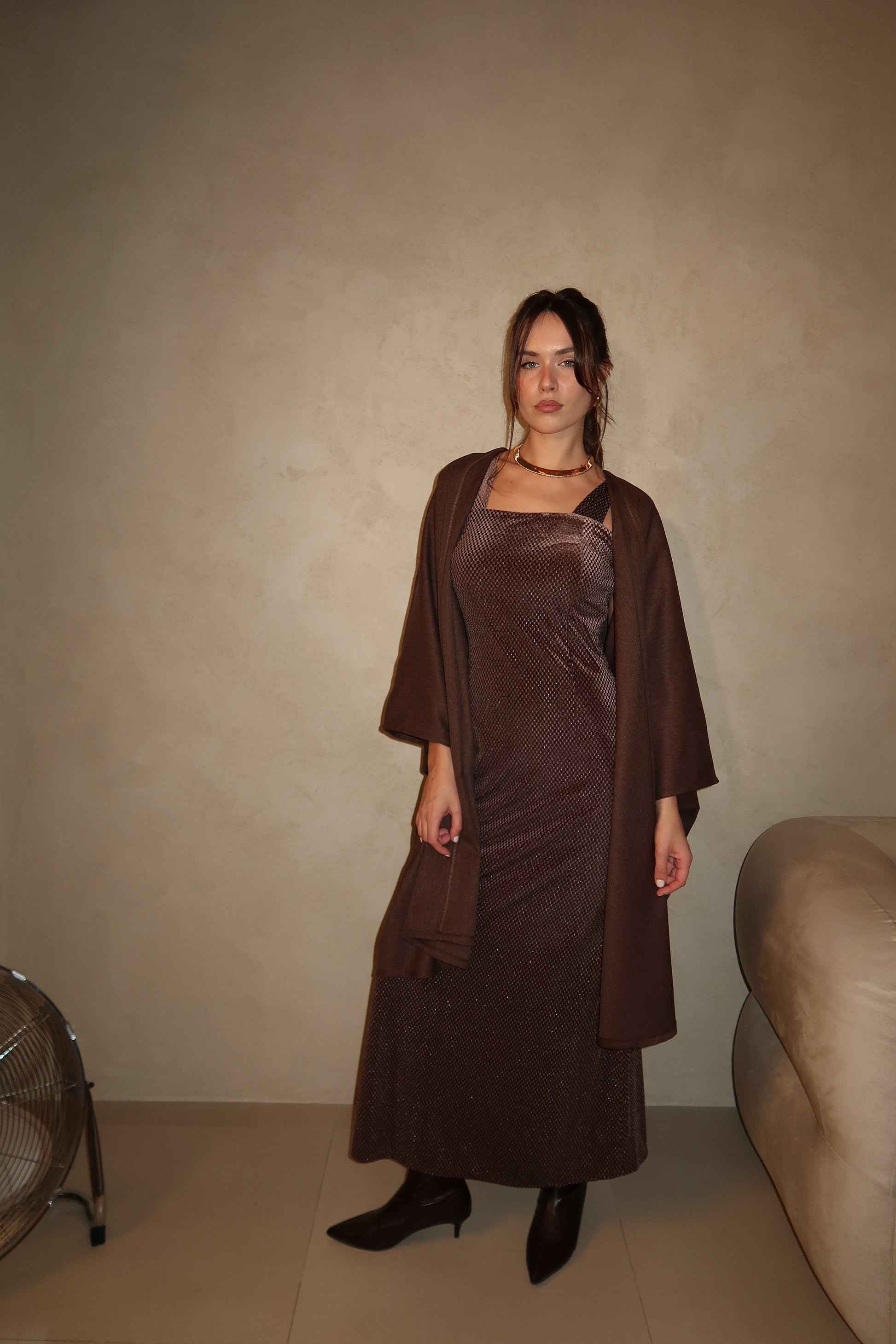 A timeless two-piece look featuring a textured brown dress paired with a lightweight cardigan. Designed for elegant occasions or elevated everyday wear, this set blends comfort with understated sophistication.