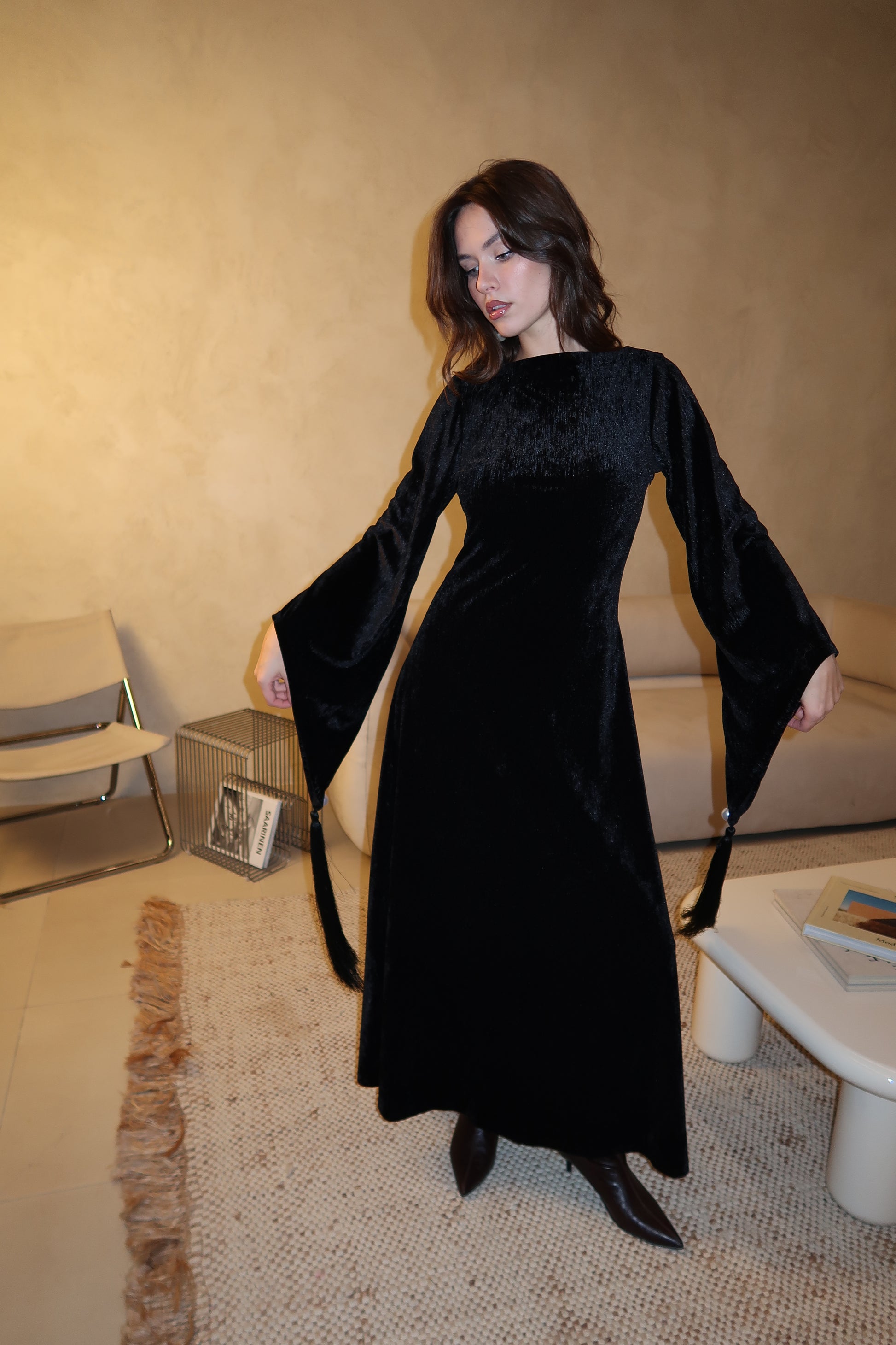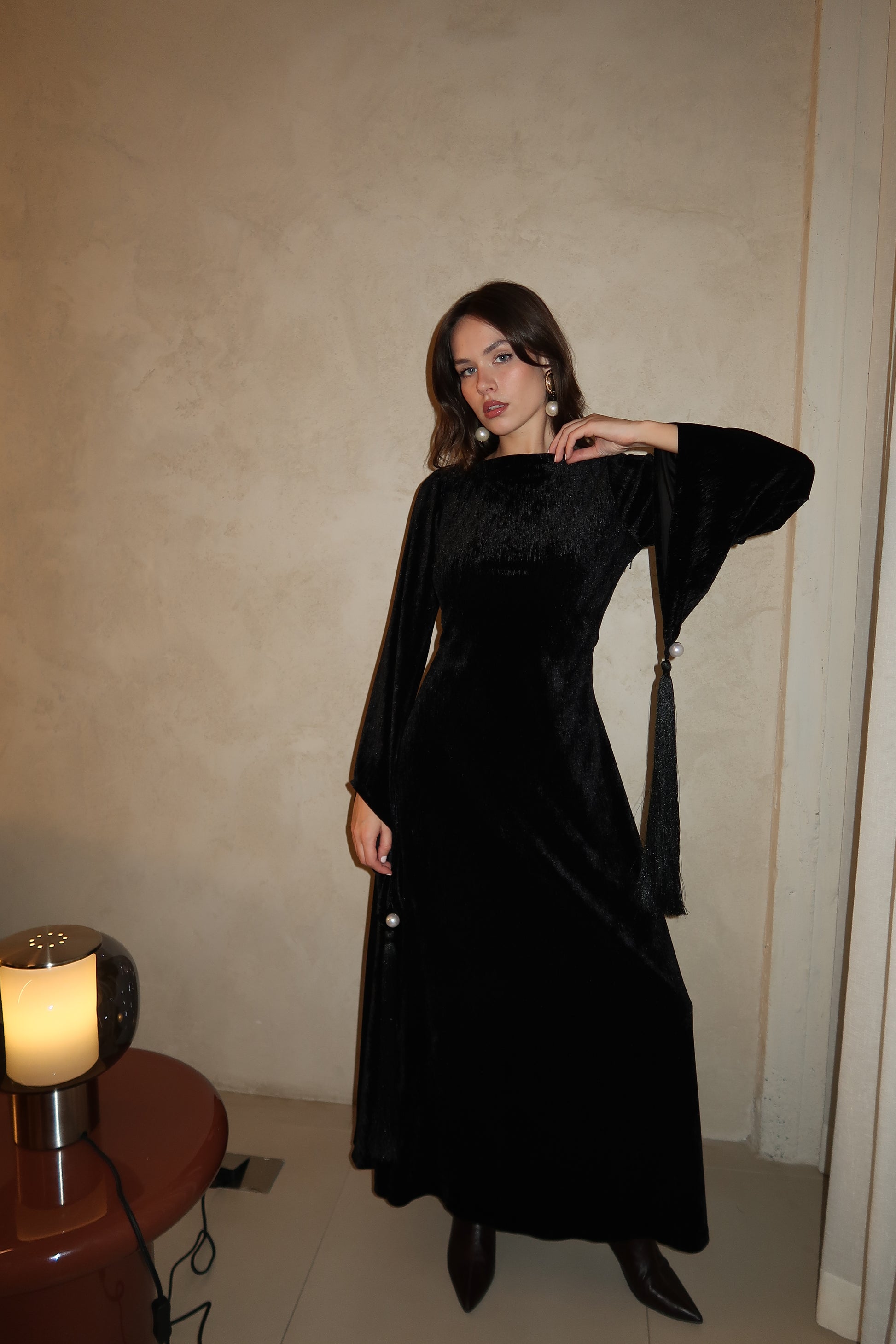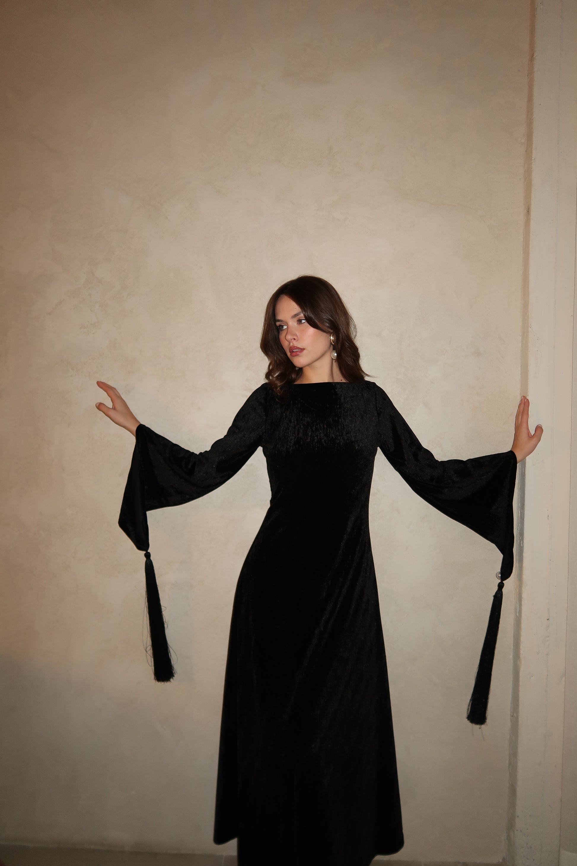 A refined black velvet dress designed with a clean silhouette and dramatic flared sleeves. Finished with pearl-accented tassel details at the cuffs, this piece balances elegance and movement for a striking evening look.