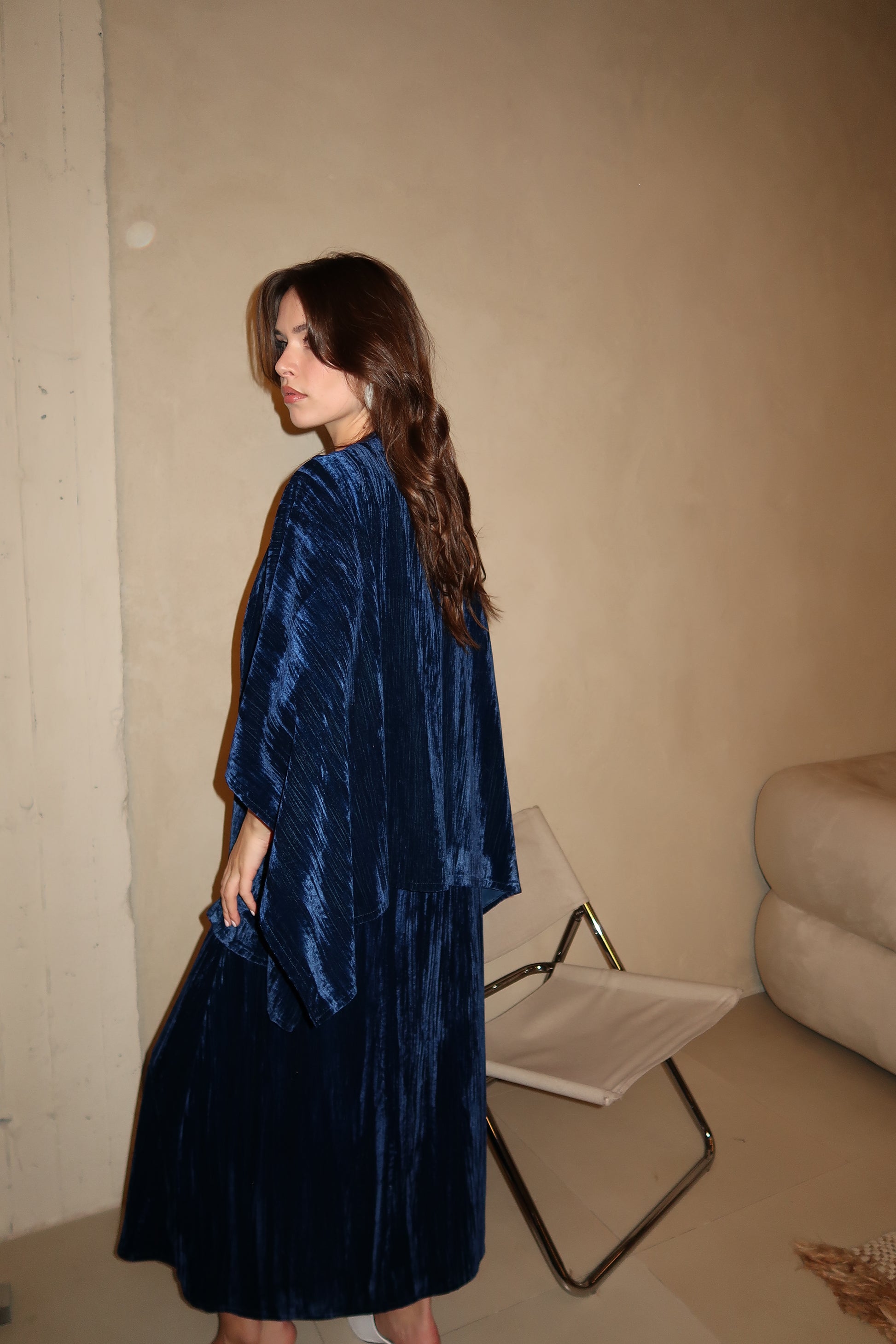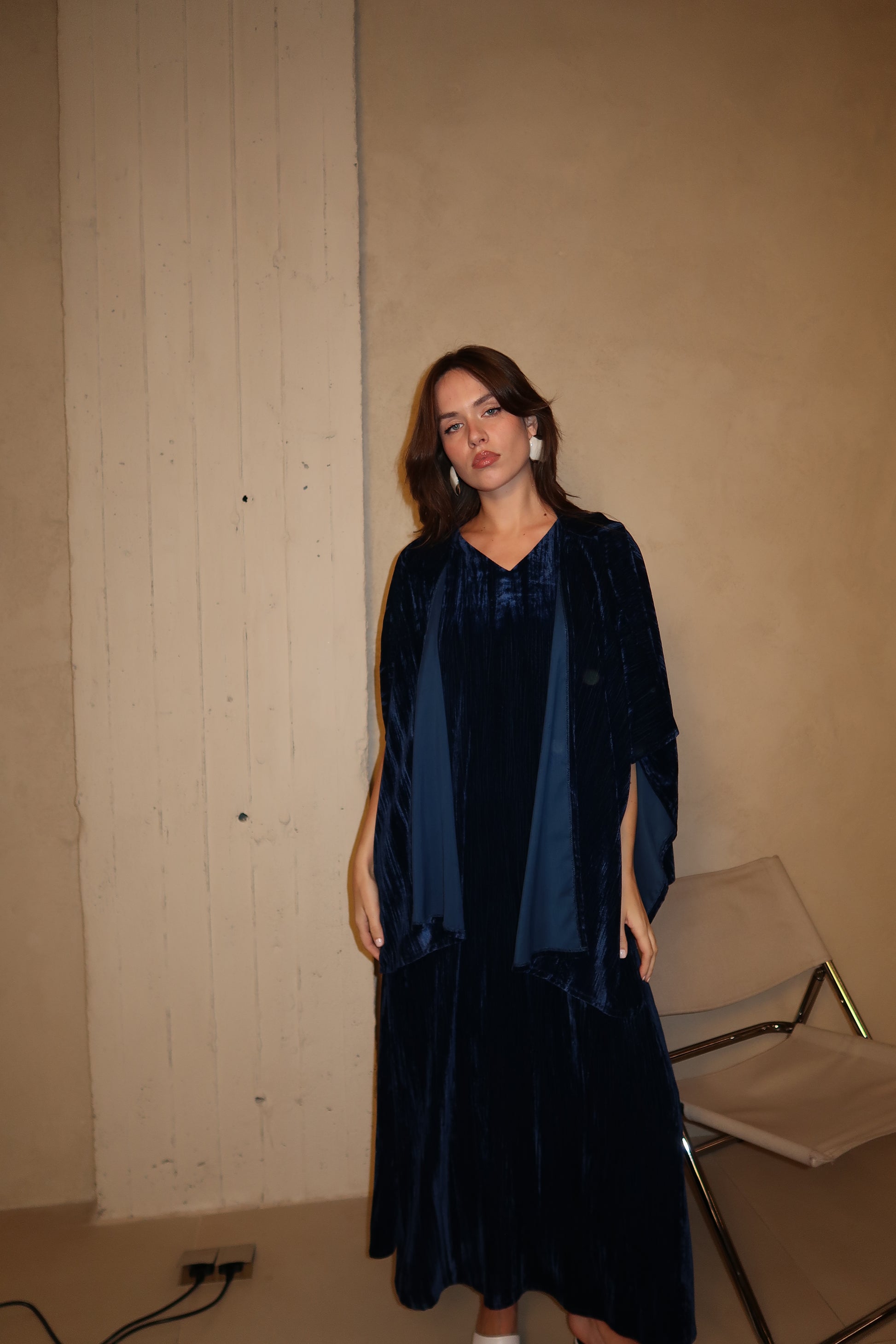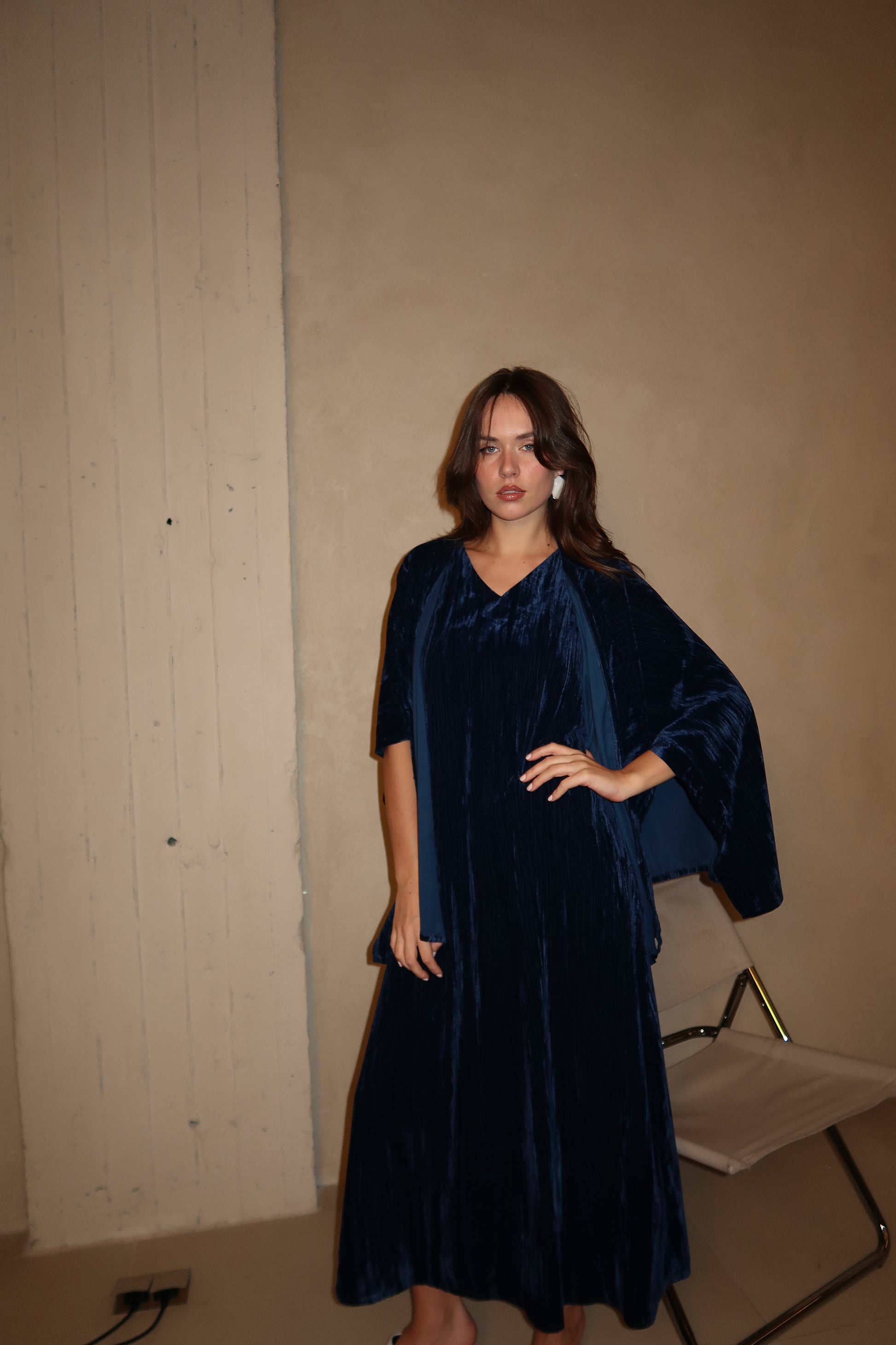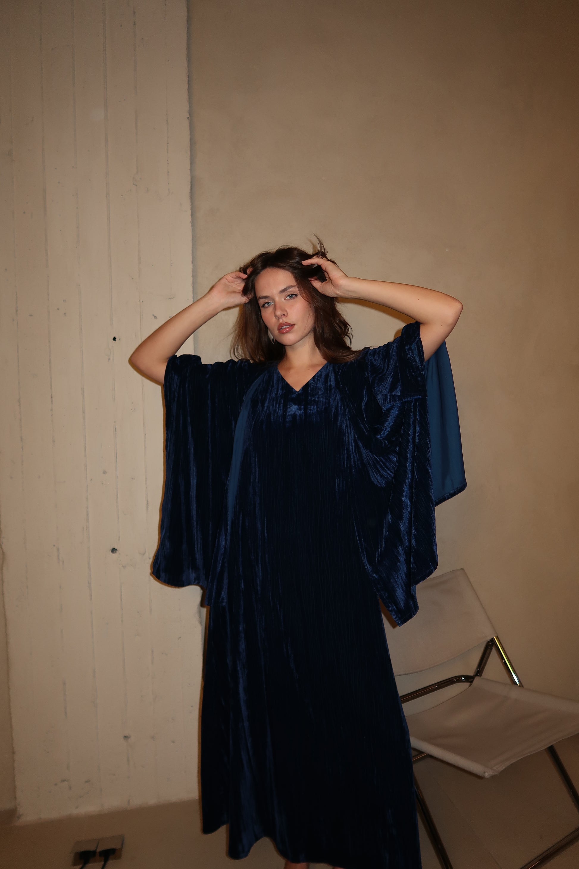 A flowing deep blue velvet dress designed with a relaxed silhouette and soft drape. The wide, fluid sleeves create effortless movement, giving this piece a refined yet comfortable feel.